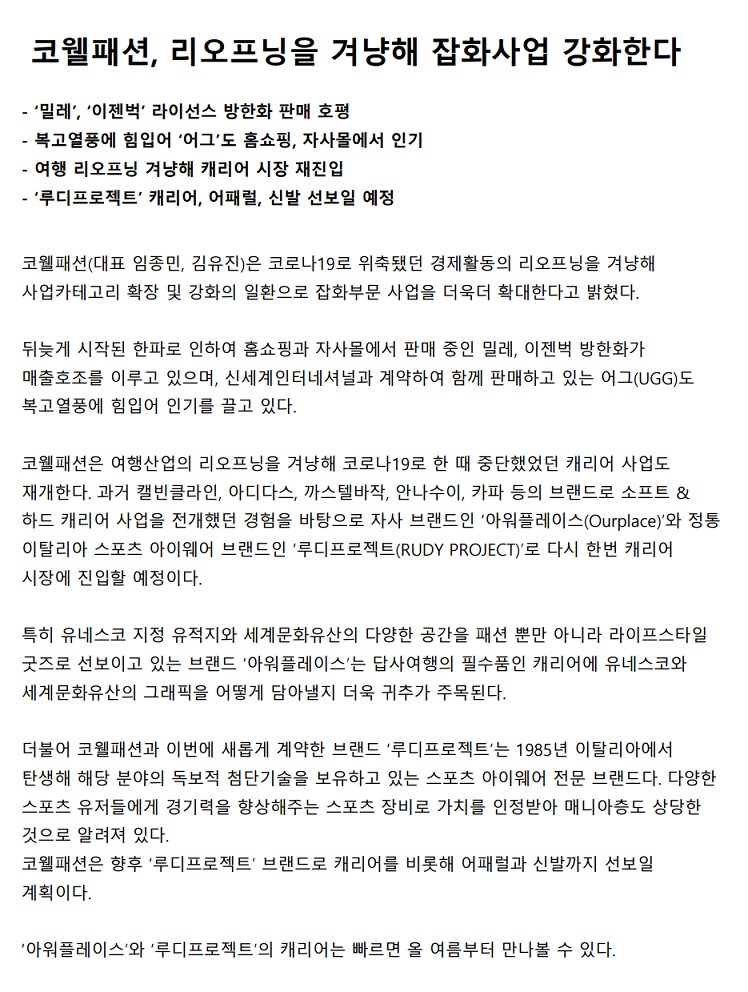 코웰패션, 리오프닝을 겨냥해 잡화사업 강화한다