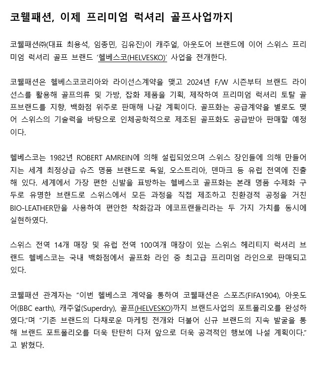 코웰패션, 이제 프리미엄 럭셔리 골프사업까지
