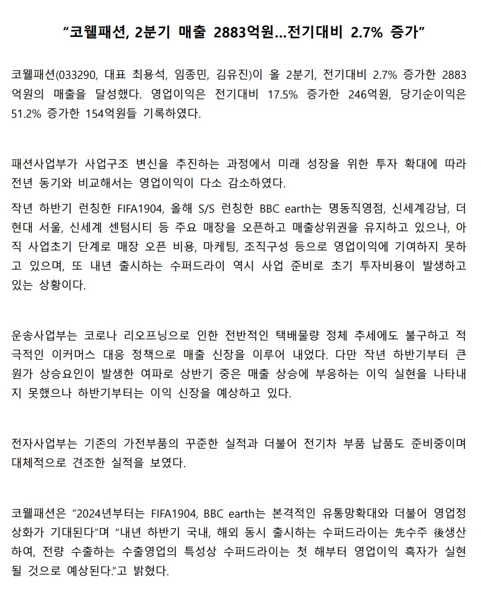 코웰패션, 2분기 매출 2883억원…전기대비 2.7% 증가
