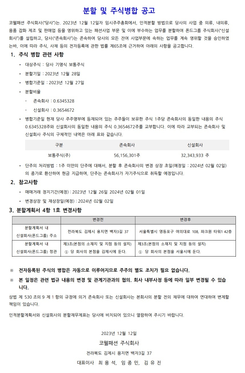 [코웰패션] 분할 및 주식병합 공고